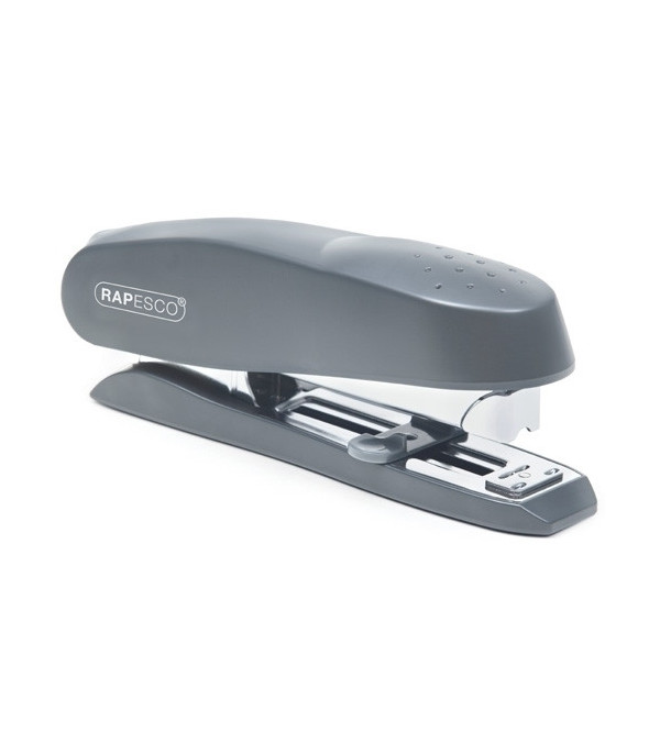 Grapadora ejecutiva de alta resistencia con carga frontal, botón de liberación del cargador para recarga fácil, chasis de acero y guía de papel ajustable. Utiliza grapas 26/6 y 24/6 para grapar hasta 20 hojas de 80gramos o grapas 26/8 y 24/8 para grapar hasta 50 hojas.