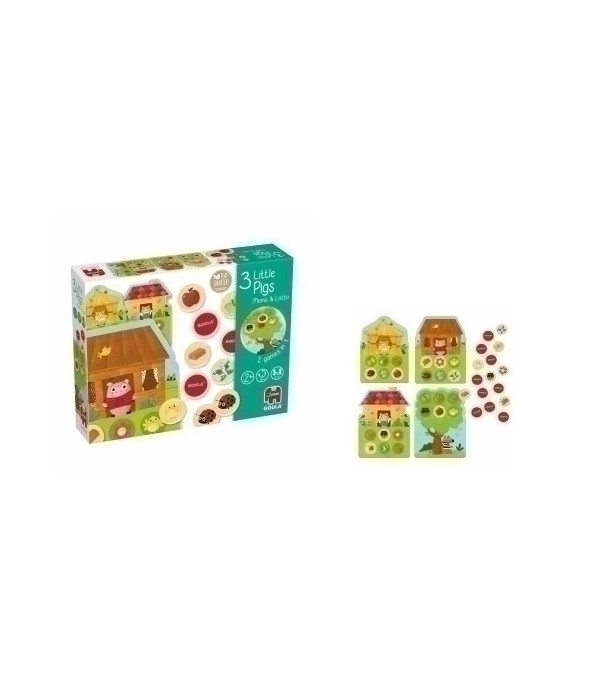 Juego educativo con ilustraciones de los 3 cerditos para jugar de dos maneras: memo (colocar todas las fichas de madera boca abajo e ir girando dos fichas en cada turno. Si las dos fichas coinciden nos las quedaremos, sino las volveremos a girar. El jugador que encuentre más parejas ganará el juego) y loto (se juega utilizando los 4 tableros de cartón ilustrados y deberemos intentar encontrar entre las fichas los objetos de nuestro tablero. Juego recomendado para un máximo de 4 jugadores). Edad: + 2 años.