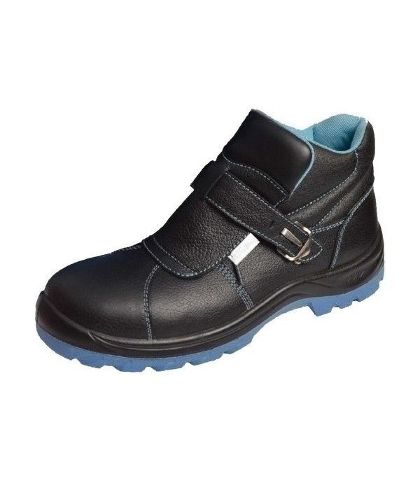Bota fabricada en piel flor vacuna color negro, cumpliendo con los análisis que indica la normativa de resistencia al desgarro, a la abrasión, a absorción y penetración de agua, a la permeabilidad y el coeficiente de vapor, etc. Entresuela, poliuretano antiestático expandido color negro. Suela, poliuretano antiestático compacto color azul. Forro de talones, trasera, cuello y lengüeta, tejido Shoe-tech color azul con espesor de 1,4 mm especial para seguridad y puntera anti-impactos para mayor seguridad.